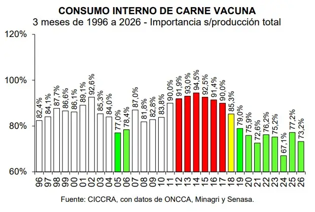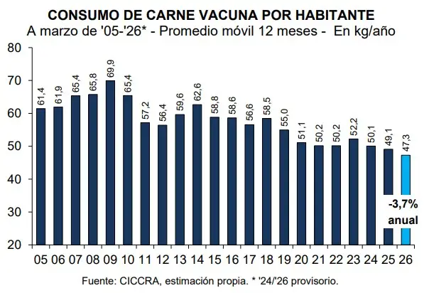 Como resultado de esta dinámica, el denominado consumo aparente en el mercado interno se ubicó en 512,8 mil toneladas, es decir, unas 56,7 mil toneladas menos. Al considerar estos datos, el consumo per cápita promedio de los últimos doce meses se estimó en 47,3 kilos por habitante al año, lo que implica un descenso del 3,7% en comparación con marzo de 2025, equivalente a una baja de 1,8 kilos por persona.