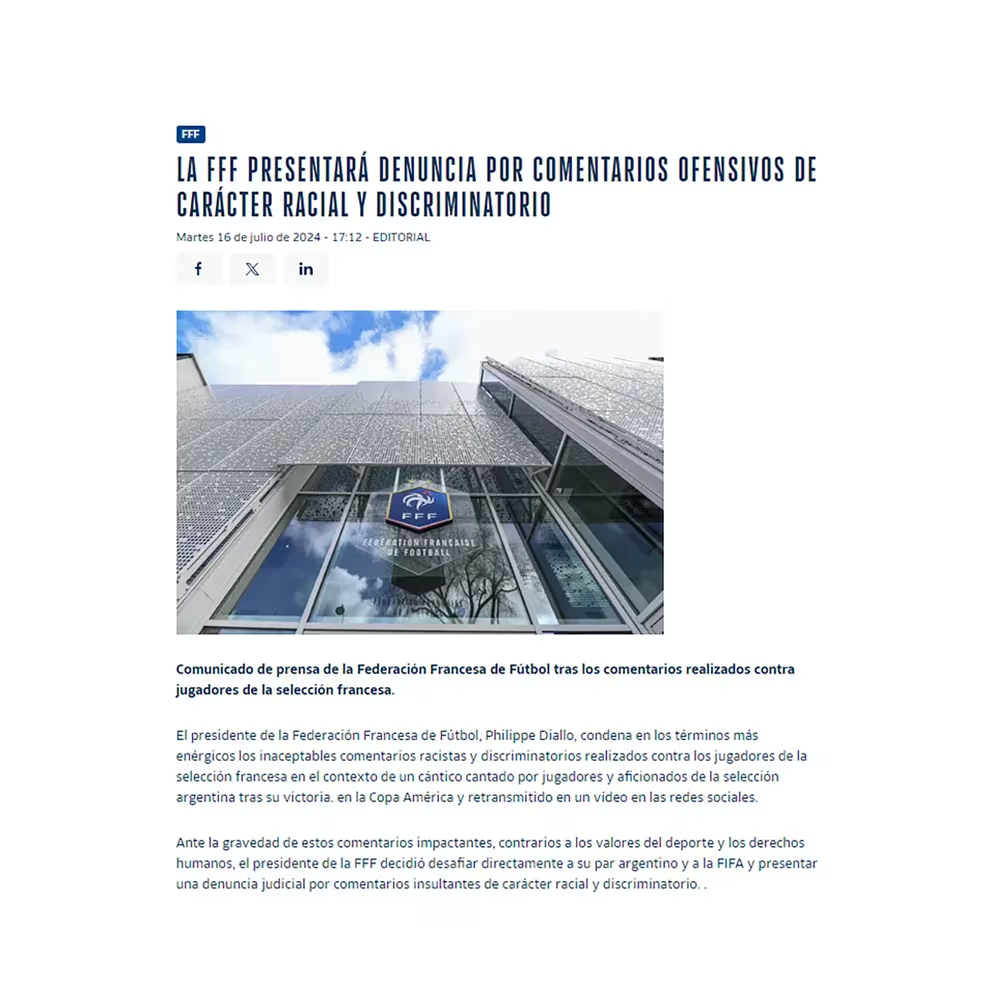 “El Presidente de la Federación Francesa de Fútbol, Philippe Diallo, condena con la mayor firmeza los inaceptables comentarios racistas y discriminatorios proferidos contra jugadores de la selección francesa en el contexto de una canción entonada por jugadores y seguidores de la selección argentina tras su victoria en la Copa América y difundida en un vídeo en las redes sociales”, afirma un comunicado de la Federación Francesa de Fútbol (FFF), en alusión al episodio que involucra a los futbolistas argentinos.