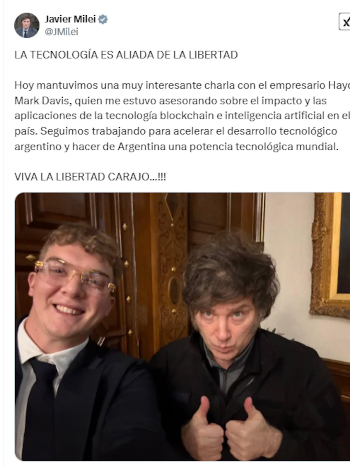 El pasado 30 de enero, Javier Milei mantuvo una reunión con el empresario Hayden Mark Davis. En aquel entonces, el mandatario sostuvo que el joven “me estuvo asesorando sobre el impacto y las aplicaciones de la tecnología blockchain e inteligencia artificial en el país. Seguimos trabajando para acelerar el desarrollo tecnológico argentino”. Hoy el nombre del empresario vuelve a quedar en el centro de la escena a partir del lanzamiento de la criptomoneda Libra, la cual tuvo un breve apoyo por parte del mandatario.
