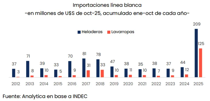 En ese sentido, la consultora reflejó que las importaciones de heladeras y lavarropas se dispararon 387,1% y 924,2%, respectivamente, entre enero y octubre de 2025 (respecto del mismo período de 2024), y que estos productos del exterior permitieron abastecer la demanda.