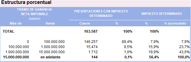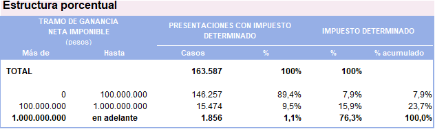 Esta información surge de las estadísticas públicas del organismo recaudador. En el cuadro 2.3.3.3.1. de «Impuesto a las Ganancias Sociedades» se segmenta esa información y permite deducir la estructura porcentual por tramo de ganancia neta.