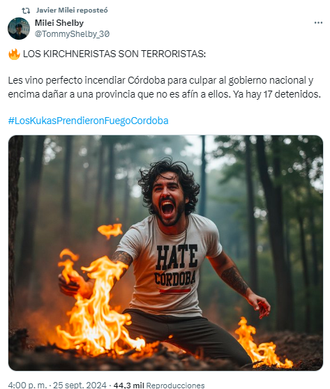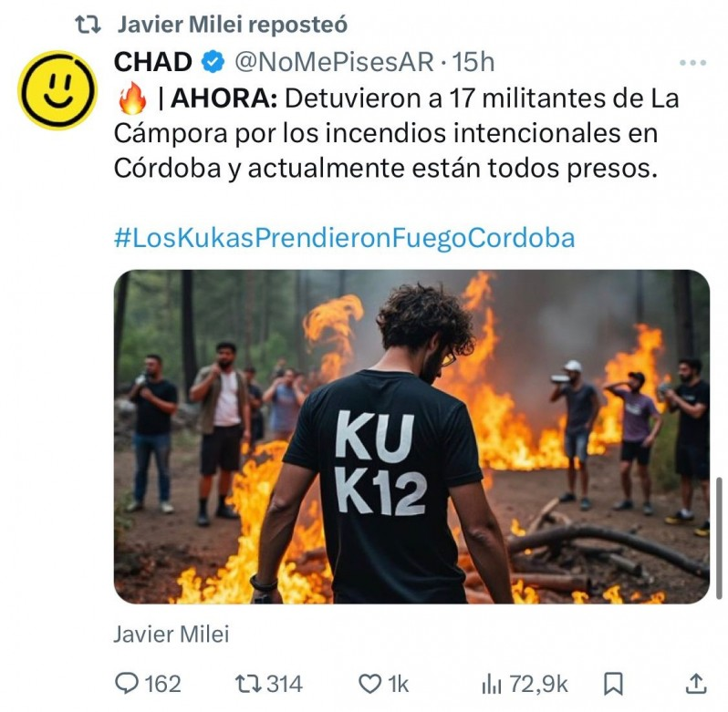 Tras su visita a la zona de los incendios, donde generó indignación porque evitó saludar a los bomberos que lo esperaron una hora al rayo del sol, Milei se concentró en sus redes sociales y empezó a compartir mensajes sobre supuestos kirchneristas detenidos por provocar los incendios.