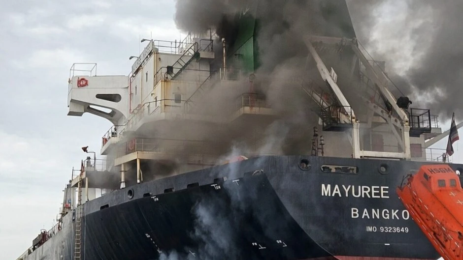 El buque tailandés Mayuree Naree prendido fuego.