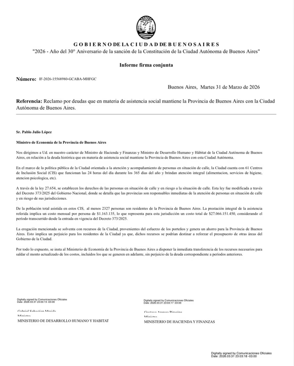 La administración porteña envió este miércoles una carta dirigida al ministro de Economía bonaerense, Pablo López, para exigir que la Provincia le pague la suma de $27.066.151.450 por el alojamiento y la atención brindada a personas que viven en la calle en la ciudad de Buenos Aires pero cuyo domicilio legal radica en territorio bonaerense.