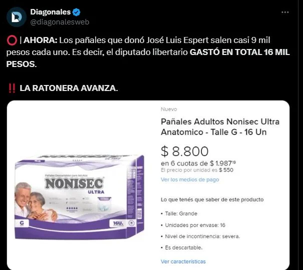 Después de ese tuit, usuarios de internet y medios digitales se tomaron el trabajo de buscar el precio de cada paquete de los pañales que donó el diputado. A razón de alrededor de $8.000 cada paquete con 16 pañales, el diputado habría gastado, aproximadamente, $16.000 en total.