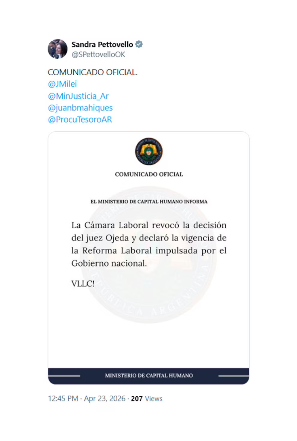 El comunicado que posteó Sandra Pettovello para difundir que la Cámara Laboral validó la Reforma Laboral (X)