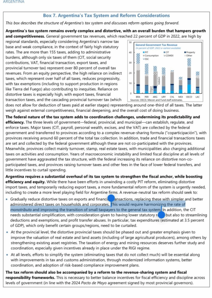 «Está en la página 16 del Staff Report del Fondo Monetario como un compromiso argentino de eliminar el monotributo», dijo el ahora diputado electo por Entre Ríos. «El FMI tiene en la mira al monotributo desde hace mucho tiempo porque quiere que Argentina avance en un régimen general para recaudar más», afirmó.