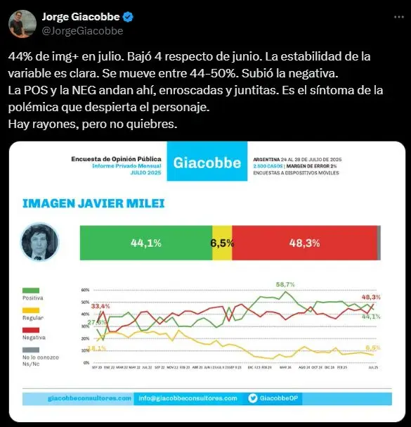 “La (imagen) positiva y negativa andan ahí, enroscadas y juntitas. Es el síntoma de la polémica que despierta el personaje. Hay rayones, pero no quiebres”, señaló el consultor desde sus redes sociales. Los resultados totales se completan con las otras dos opciones que mostraba dicha encuesta: la imagen negativa de Milei es del 48%, mientras que el 6,5% manifestó que lo ve “regular”.