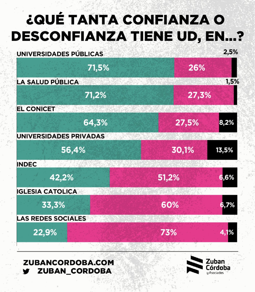 El estudio también indagó en el nivel de confianza en las instituciones argentinas. Las universidades públicas y el sistema de salud público son las más valoradas, con un 71% de menciones positivas. Sin embargo, la Justicia es la institución peor evaluada, con un 86% de desconfianza, seguida de cerca por el Congreso (82%) y los partidos políticos (76%).