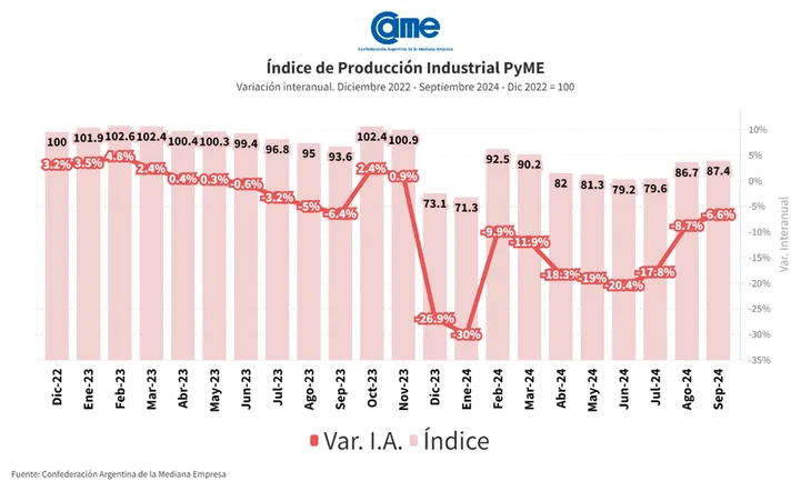 La actividad manufacturera de las pymes descendió 6,6% interanual en septiembre y acumula una retracción de 15,1% en los primeros nueve meses del año frente al mismo período de 2023. Es la menor tasa de caída en 10 meses y en la comparación intermensual desestacionalizada se verifica un incremento del 3,7%, según la Confederación Argentina de la Mediana Empresa (CAME).