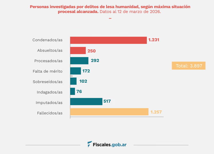 Además, hay 504 personas detenidas por estos crímenes: 425 de ellas se encuentran en prisión domiciliaria. Del relevamiento de la Procuraduría de Crímenes contra la Humanidad se desprende que la cantidad de absueltos es de 250.