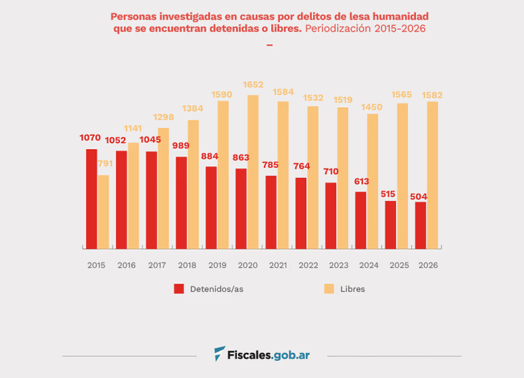 Desde el Ministerio Público Fiscal indican que, en 2026, a pesar de los 504 represores detenidos, la brecha entre personas privadas de la libertad y personas efectivamente libres “es la mayor del registro histórico que lleva la procuraduría desde 2015”. Argumentan que esta situación es provocada “por la sostenida reducción de la cantidad de personas detenidas”.