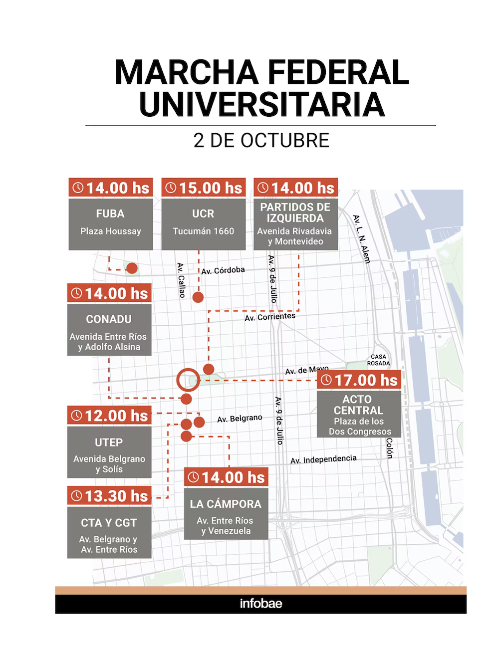 A la Plaza de los Dos Congreso -el escenario estará ubicado donde termina la Avenida de Mayo, de espaldas a la Casa Rosada y de frente al Palacio Legislativo- llegará una columna de estudiantes, que va a salir de Plaza Houssay, irá por Avenida Córdoba hasta Callao y de allí hasta la zona de la concentración. La segunda columna se reunirá en la esquina de Entre Ríos y Belgrano, y estará formada por rectores del CIN, integrantes de la FUA, y sindicatos docentes y no docentes.