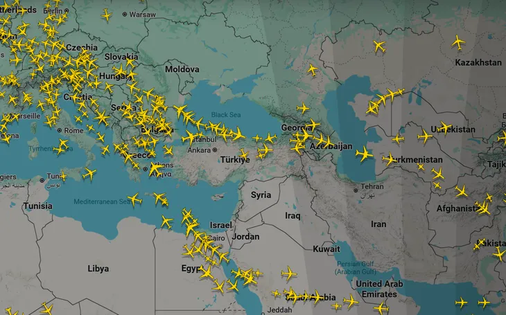 El sitio flightRadar24 mostraba este lunes el gran vacío de tránsito aéreo sobre el espacio de los países en conflicto.