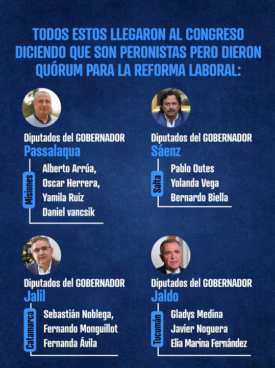 Osvaldo Jaldo llevó a un peronismo unido a un triunfo contundente el año pasado con más del 50% de los votos tucumanos contra la propuesta de LLA. En campaña vociferaba que le iba a “cortar la peluca al león” en su provincia, y dejó por escrito en redes que se opondría a cualquier reforma laboral, entre otras cosas. Gustavo Sáenz fue en poncho hasta la puerta de la Casa Rosada el año pasado a reclamar ante las cámara de TV por las obras que el Gobierno tiene paradas en Salta. Raul Jalil fue uno de los principales impulsores de la candidatura de Sergio Massa en 2023, postulación para la que también jugaron los misioneros del Frente Renovador para la Concordia. Párrafo aparte para Claudio Vidal, ex secretario general de los petroleros de Santa Cruz, que llegó a gobernador por su rol de defensa de los trabajadores y el jueves mandó a su diputados a dar quórum y votar la reforma más anti obrera desde la dictadura para acá.