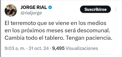 Tuit de Jorge Rial, 9 y media de la mañana del jueves 31 de octubre de 2024: «El terremoto que se viene en los medios en los próximos meses será descomunal. Cambia todo el tablero. Tengan paciencia».