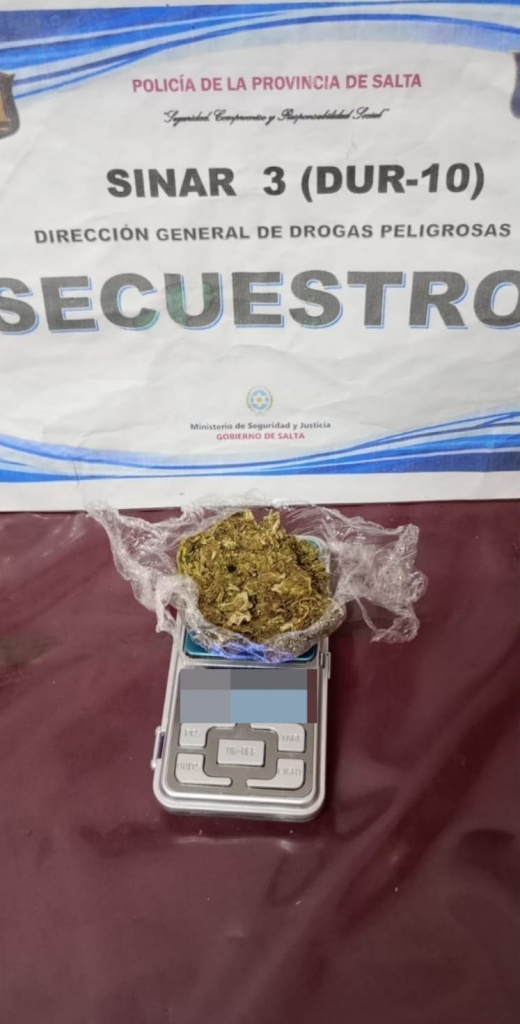 Ante la situación, dieron intervención al personal de Drogas Peligrosas, quienes al realizar las tareas de campo y narcotest, constataron que se trataba de cannabis sativa, siendo más de 60 dosis de esta sustancia. La persona de 21 años fue aprehendida y puesta a disposición de la Justicia por infringir a la Ley N° 23.737 de Estupefacientes.