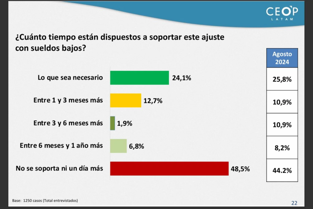 La mirada es cada vez más pesimista respecto a la situación económica del país y la del núcleo familiar y personal. Respecto a esto último, cada medición crece el nñumero de quienes responden que sus ingresos no les alcanzan para llegar a fin de mes: pasaron del 28,3 al 29,6% de agosto a septiembre. Los que dijeron que tienen dificultades para llegar fueron la mayoría: 55,5% de los encuestados. Apenas un 14% aseguró que no tiene problemas para afrontar sus gastos. Por esta realidad, quienes dijeron que no le otorgan ni un día más de tolerancia al ajuste oficial llegaron en septiembre al 48,5%, cuatro puntos por encima de agosto.
