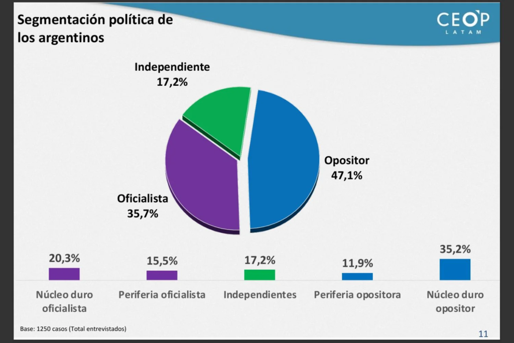 Pese a todos estos números negativos y las perspectivas sombrías, el informe marca como un dato a tener en cuenta que todavía hay un 35,7% que se identifica como oficialista, transcurridos ya casi diez meses de una gestión que dio pocas alegrías. Con todo, se trata de alrededor de cuatro puntos menos que en la medición anterior. Un dato que señala el trabajo es que ese porcentaje que deja de considerarse oficialista no pasa automáticamente a las filas de las oposición sino que engrosa mayoritariamente el sector independiente, sin simpatías definidas. En este último trabajo los opositores al Gobierno alcanzaron el 47,1% mientras que el 17,2% se declaró independiente.