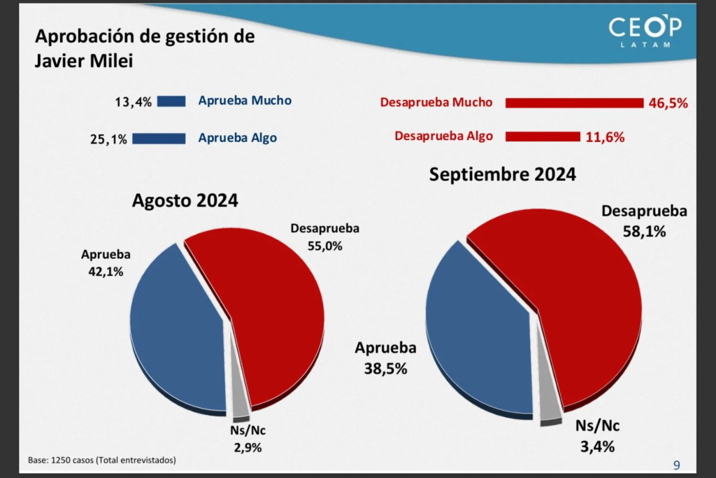 La imagen de Milei llegó al 56% de respuestas negativas, en desgaste progresivo desde abril, justamente en ocasión de la primera marcha universitaria. Más pronunciada todavía fue la caída en la curva de aprobación, que cayó de los 47 puntos que mostraba en abril a 40 en septiembre, el punto más bajo desde el inicio de la medición. Sólo en el último mes, Milei perdió cuatro puntos de apoyos. La aprobación de la gestión mostró números parecidos a la imagen presidencial, con dos puntos más de rechazos y dos menos de apoyos. Un dato a tener en cuenta: quienes dijeron aprobar «mucho» la gestión fueron apenas el 13,4% de los entrevistados. En cambio, los que desaprueban «mucho» escalaron al 46,5%.