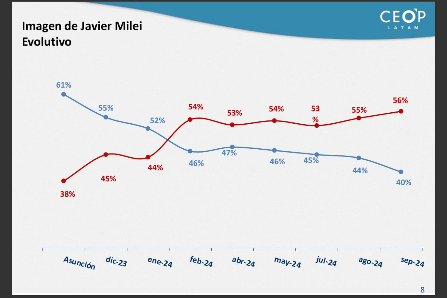 La imagen de Milei llegó al 56% de respuestas negativas, en desgaste progresivo desde abril, justamente en ocasión de la primera marcha universitaria. Más pronunciada todavía fue la caída en la curva de aprobación, que cayó de los 47 puntos que mostraba en abril a 40 en septiembre, el punto más bajo desde el inicio de la medición. Sólo en el último mes, Milei perdió cuatro puntos de apoyos. La aprobación de la gestión mostró números parecidos a la imagen presidencial, con dos puntos más de rechazos y dos menos de apoyos. Un dato a tener en cuenta: quienes dijeron aprobar «mucho» la gestión fueron apenas el 13,4% de los entrevistados. En cambio, los que desaprueban «mucho» escalaron al 46,5%.