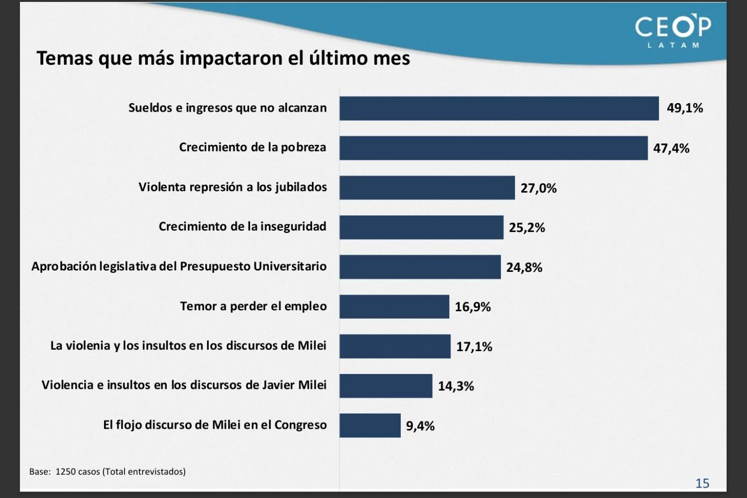 Las precupaciones de los entrevistados pasaron por la malaria económica, reflejada en el índice de pobreza récord difundido por el Indec. Los sueldos e ingresos que no alcanzan junto al crecimiento de la pobreza fueron los dos temas que más impactaron durante el último mes. Le siguieron la represión a las marchas de jubilados -en la que una niña de 10 años recibió una descarga de gas pimienta en la cara- y el crecimiento de la inseguridad, un tema del que no se habla mucho en los medios afines al Ejecutivo. Los cuatro temas apuntalaron el malhumor de la mayoría de los consultados con la situación general.