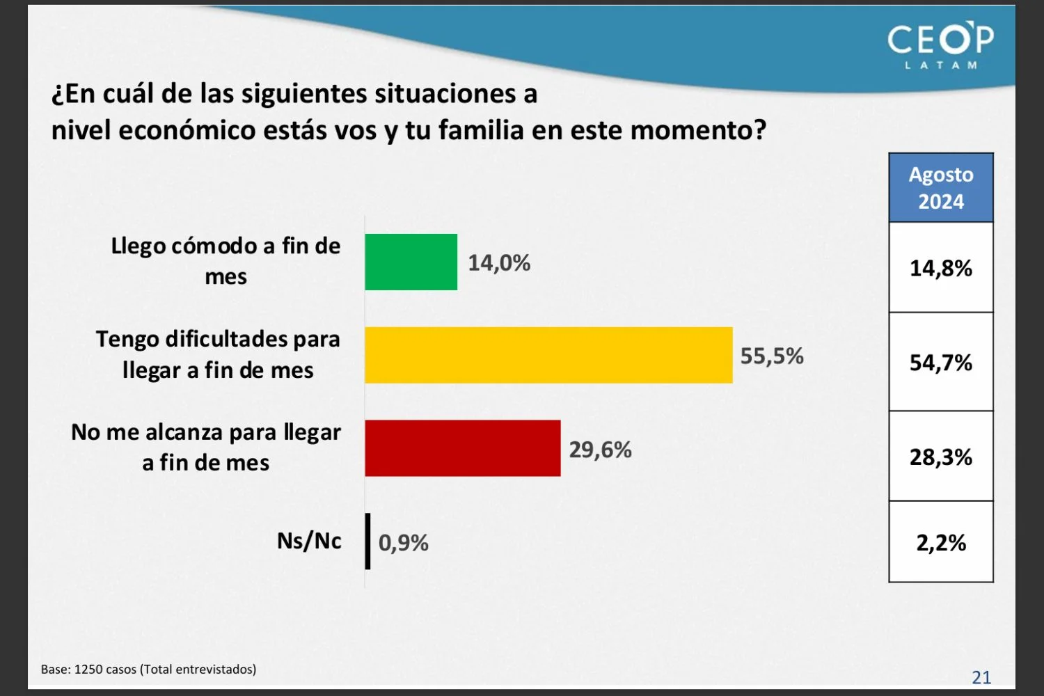 La mirada es cada vez más pesimista respecto a la situación económica del país y la del núcleo familiar y personal. Respecto a esto último, cada medición crece el nñumero de quienes responden que sus ingresos no les alcanzan para llegar a fin de mes: pasaron del 28,3 al 29,6% de agosto a septiembre. Los que dijeron que tienen dificultades para llegar fueron la mayoría: 55,5% de los encuestados. Apenas un 14% aseguró que no tiene problemas para afrontar sus gastos. Por esta realidad, quienes dijeron que no le otorgan ni un día más de tolerancia al ajuste oficial llegaron en septiembre al 48,5%, cuatro puntos por encima de agosto.