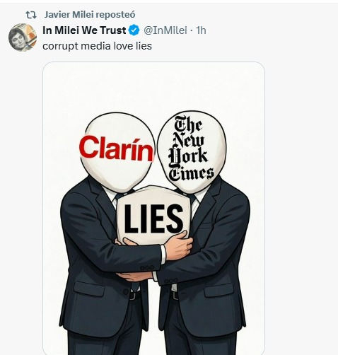 Luego Milei retuiteó a otro usuario que dijo que «Clarín sin pauta miente», junto a una enumeración de conceptos sobre el rol de los medios.