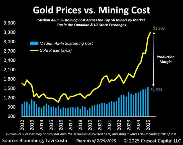 Hoy, el oro cotiza en torno a los u$s 3.400 (hace una semana estaba más cerca de los u$s 3.300 como marca el gráfico), mientras que el costo promedio de extracción está cerca de u$s 1.500. Esto significa que las mineras están operando con márgenes del 100%, algo históricamente inusual.