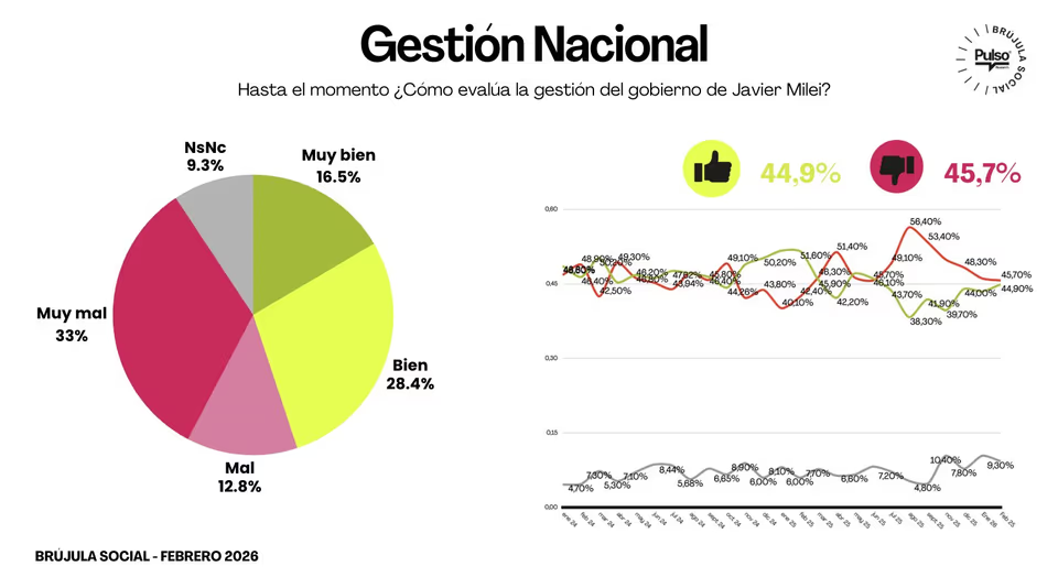 Desde la agencia sostienen que la aprobación de la gestión “libertaria” “se ha estabilizado en torno al 44 % por tercer mes consecutivo”, con un rechazo que tiene una tendencia a la baja hace 5 meses, en el periodo desde las elecciones legislativas que consolidaron a Javier Milei con un 40 % de apoyo nacional. El rechazo a la administración de LLA se muestra apenas superior: 45,7 %.