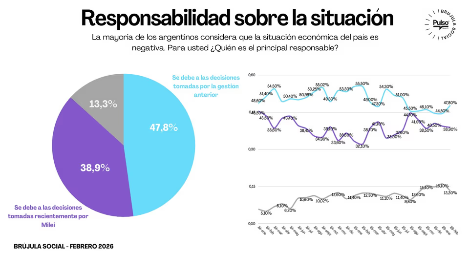 “La responsabilidad sobre la situación económica se mantiene como uno de los principales elementos que inviste de indulgencia al gobierno: el 48% culpa al gobierno anterior y el 38% le recrimina la situación al gobierno actual”, plantean en el informe de Brújula Social de Pulso.