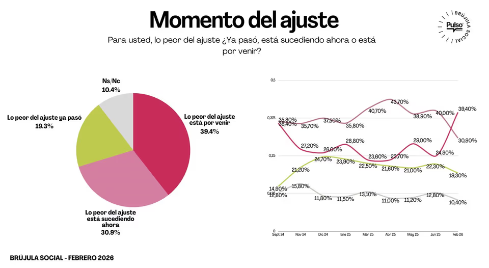 A esto se suma casi un 35 % que piensa que “se está ajustando algunas cosas que corresponden y otras que no”. Solo el 16 % afirma que el Presidente está ajustando donde corresponde, lo que significan 5 puntos porcentuales menos que desde mayo de 2025.