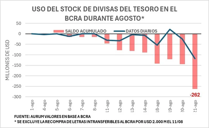 Pero este mes la situación cambió radicalmente. Este gráfico de Aurum Valores muestra cómo el Tesoro Nacional usó su stock de divisas en el BCRA durante agosto. Así se puede ver cómo no solo el saldo acumulado de divisas cayó de forma sostenida durante el mes, sino que al 21 de agosto, el Tesoro ya había usado u$s262 millones de sus depósitos en dólares en el BCRA. A su vez, la evolución diaria indica que los egresos diarios de divisas, se intensifican en la segunda mitad del mes, especialmente entre los días 16 y 21 de agosto.
