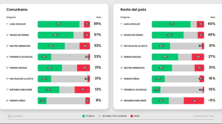 En cambio, en el resto del país el orden es un poco distinto. Aunque también lo lidera Axel Kicillof con 60%, luego le siguen Wado de Pedro, con 49%; Natalia de la Sota, con 31%; Sergio Massa, con 27%; Mayra Mendoza, con 21%; Sergio Uñac, con 16%; Federico Achával, con 15%; y finalmente Máximo Kirchner, con -6%.