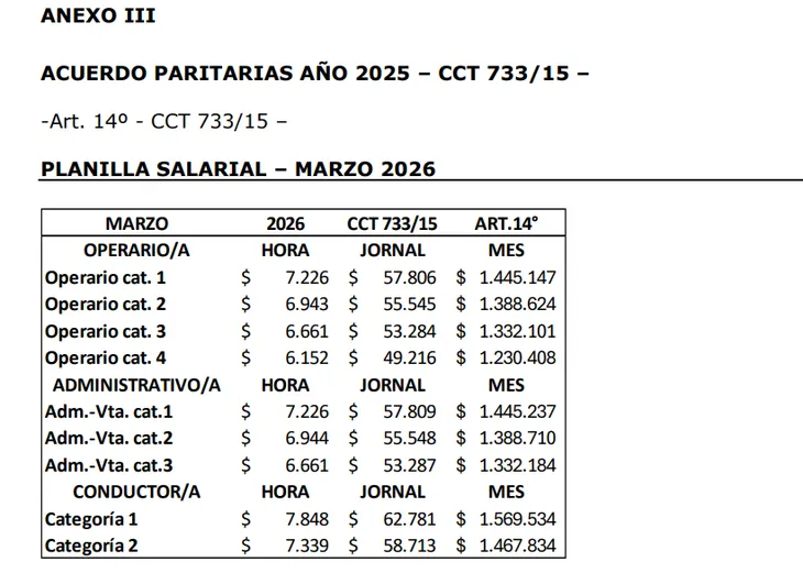 Para los salarios de marzo, el incremento es del 2%, mientras que para los de abril se sumará un 1,8%. Además, se estableció el pago de una suma fija no remunerativa de $53.000 correspondiente a marzo, de la cual $49.471 se incorporarán al salario básico a partir de abril, consolidando así parte de la mejora en los ingresos.