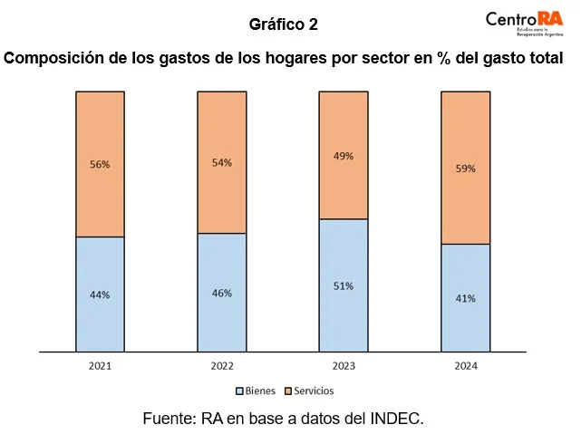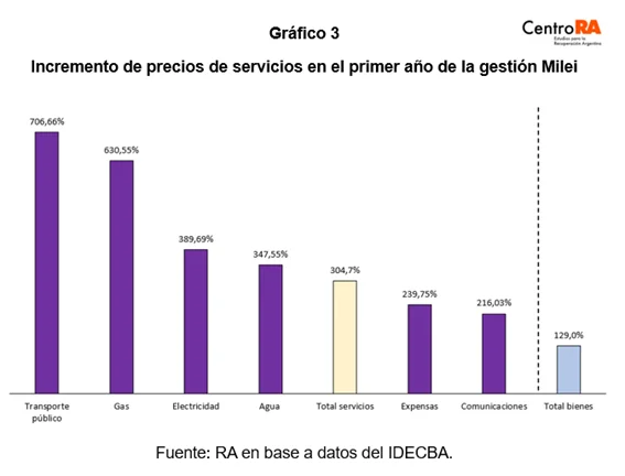 En relación, un segundo impacto tiene que ver con la evidente reasignación del presupuesto familiar. “La inflación intermensual de los servicios superó la de los bienes en once de los doce meses del primer año de gobierno, lo que hizo que los servicios se encarecieran aproximadamente un 33% en términos relativos”, aclararon desde el Centro R.A. Esta disparidad se tradujo en un «efecto tijera» que implicó que mientras los ingresos se “esforzaban” por seguir el ritmo de la inflación general, el costo de vida se disparaba, cada vez más, por el lado de los servicios.