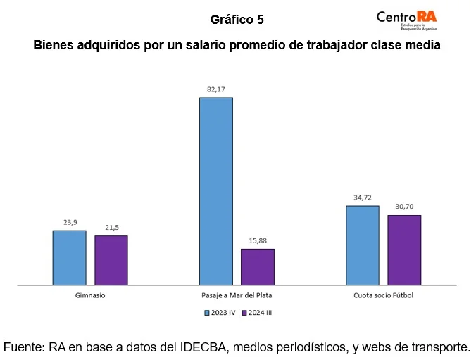 Si se mide la cantidad de bienes que se puede comprar con un ingreso promedio en la era Milei se detecta que una persona de clase media puede pagar casi medio año menos de la cuota social de un club de fútbol, dos meses menos de gimnasio y casi 66 pasajes menos a Mar del Plata en tren.