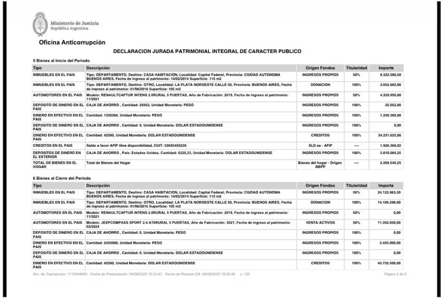 Según la última declaración jurada pública de Adorni –correspondiente al ejercicio 2024 y que fue presentada el 4 de agosto de 2025– el funcionario declaró únicamente dos inmuebles: el 50% de un departamento en Capital Federal y un departamento al 100% en La Plata. “No registró ningún bien en Exaltación de la Cruz ni en ningún country o barrio cerrado. Las casas en el Country Indio Cuá tienen un valor de mercado que oscila entre USD 129.000 y USD 249.000, según portales inmobiliarios”, detalló el comunicado.