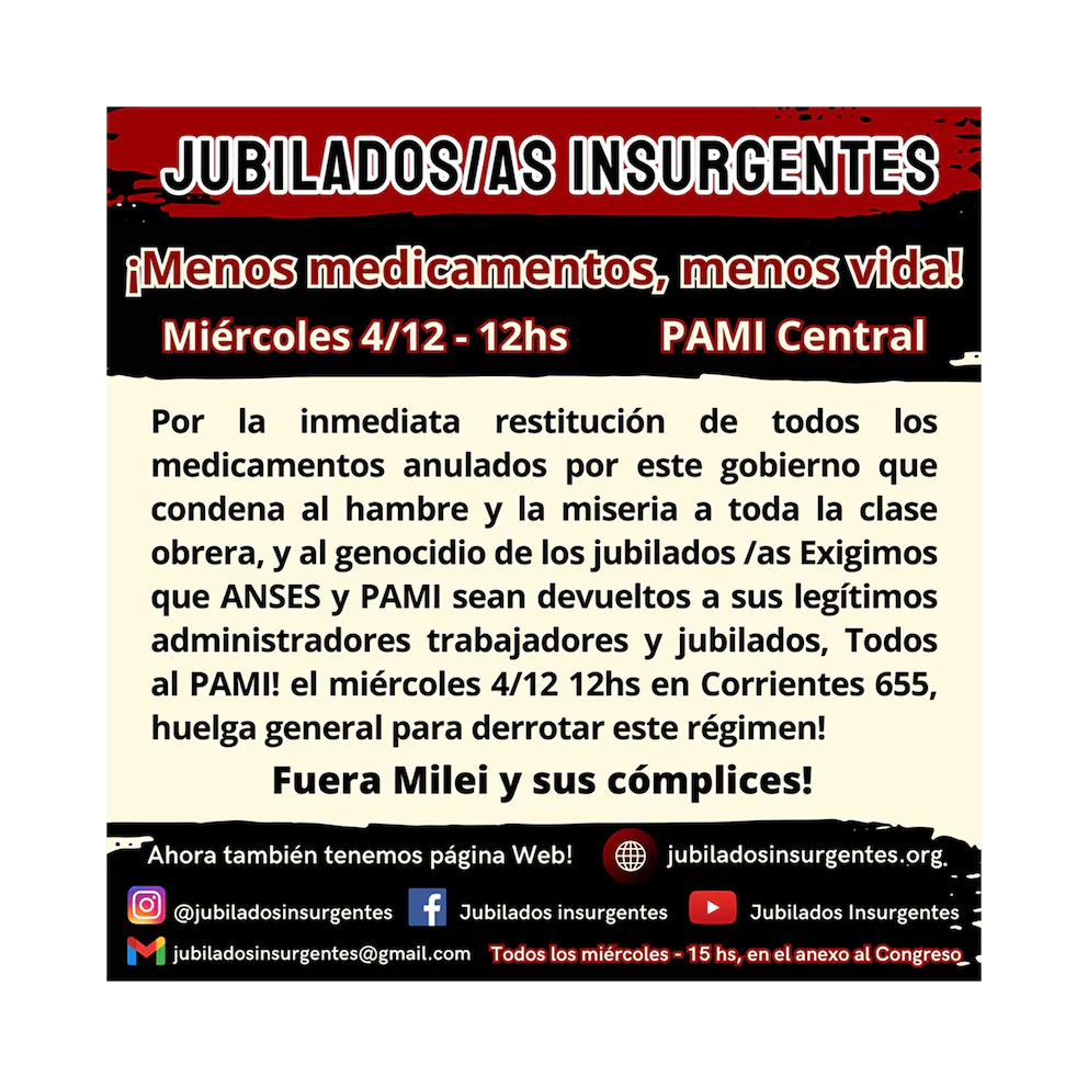 Según precisaron desde Jubilados Insurgentes, la organización detrás de la medida, la movilización será este miércoles a las 12 horas en Avenida Corrientes 655, barrio de San Nicolás. “Por la inmediata restitución de todos los medicamentos anulados por este gobierno que condena al hambre y la miseria a toda la clase obrera, y al genocidio de los jubilados”, reza el comunicado de la agrupación, publicado en redes sociales.