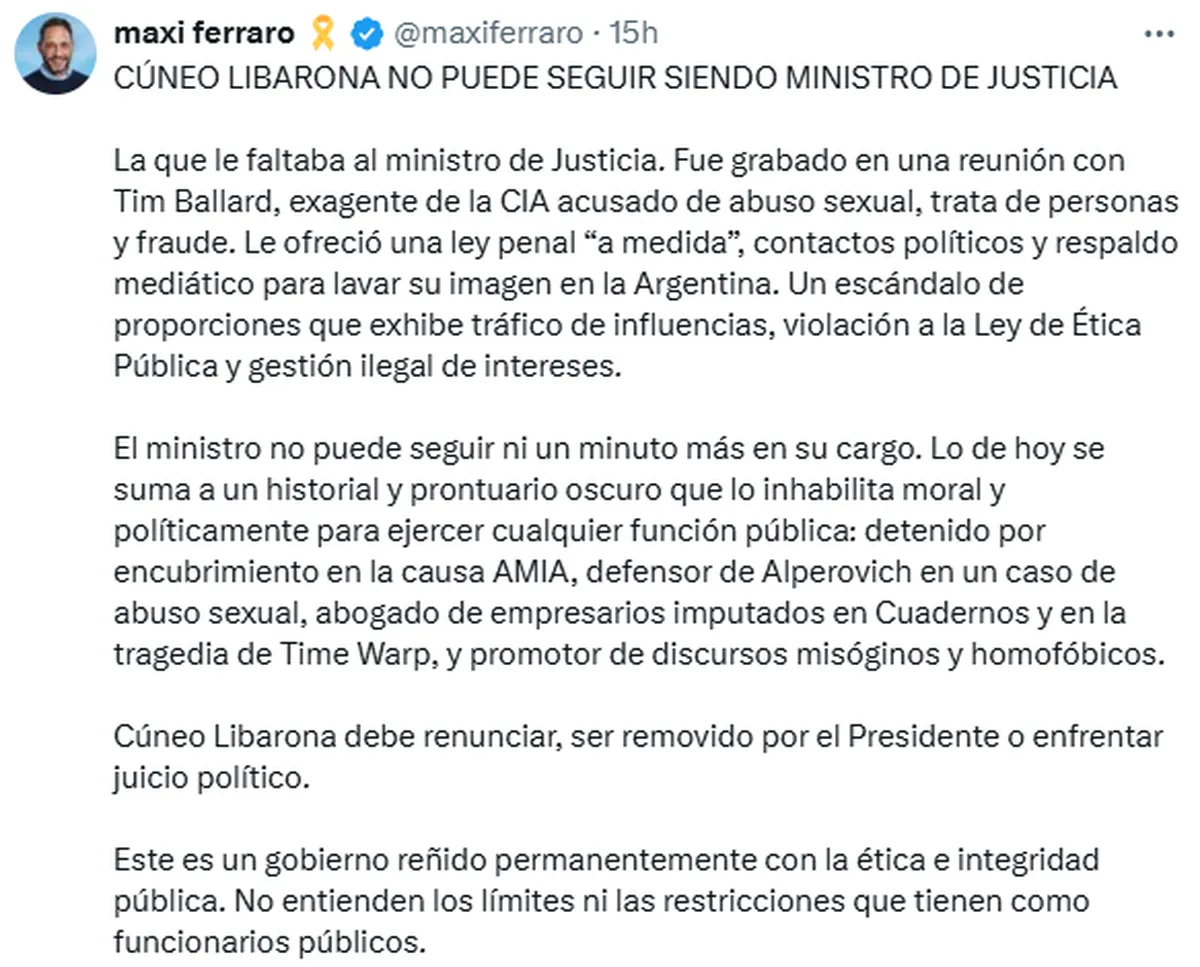 También se sumó el diputado Maximiliano Ferraro, de la Coalición Cívica, quien fue aún más duro en su declaración pública: “Lo grabaron ofreciéndole una ley penal a medida, contactos políticos y cobertura mediática a alguien acusado de trata, fraude y abuso sexual. Es tráfico de influencias en su máxima expresión y una violación a la Ley de Ética Pública”.