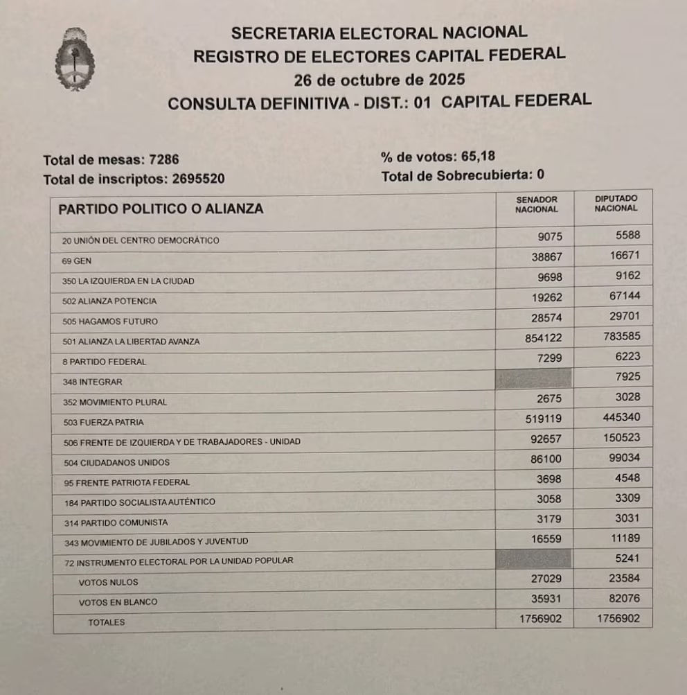 Según los datos del escrutinio definitivo de la Justicia Electoral distrito CABA la Libertad Avanza obtuvo 854.122 votos para la categoría senador y 783.585 para diputados. Fuerza Patria, 519.119 y 445.340, respectivamente. El Frente de Izquierda 92.657 y 150.523; mientras que Ciudadanos Unidos, la coalición de Lousteau, cosechó 86.100 para la Cámara alta y 99.034 para Diputados.