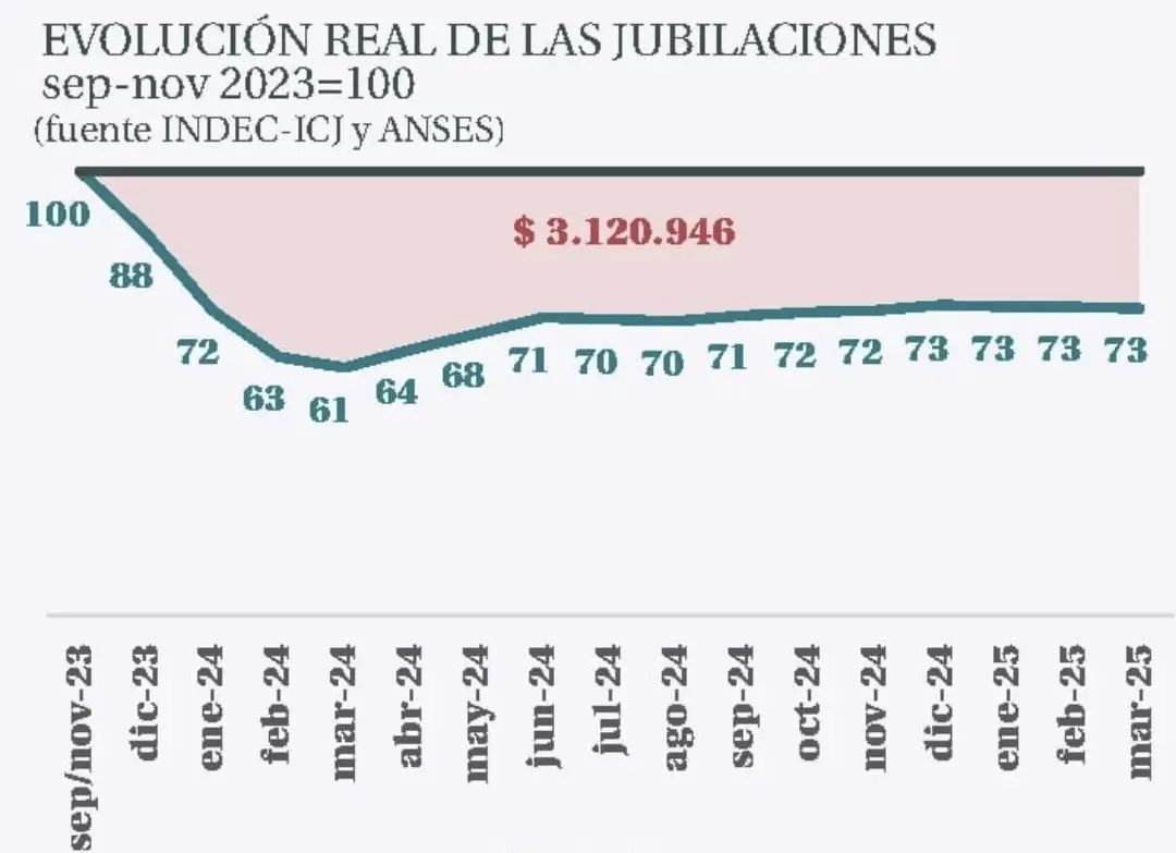 Para entender este fenómeno es clave analizar el derrotero de los ingresos de la población adulta mayor, que viene sufriendo una enorme pérdida de su poder adquisitivo. “Las jubilaciones se estabilizaron en un nivel que implica una caída del 27% del poder de compra desde que gobierna La Libertad Avanza”, plantearon desde el Mirador de la Actualidad del Trabajo y la Economía (MATE). Como resultado, esto implicó desde entonces una pérdida acumulada superior a los 3 millones de pesos ($3.120.946 por jubilado).