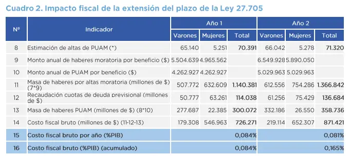 En detalle, se propone extender por dos años la moratoria previsional, lo que permitiría que 441.226 nuevos beneficiarios regularicen su situación y puedan acceder a una jubilación. Según estimó la Oficina de Presupuesto del Congreso (OPC) la prórroga por dos años del régimen de regularización previsional previsto en la ley 27.805 tendría un costo estimado del 0,084% del PBI para el primer año y del 0,081% para el segundo, totalizando un costo fiscal acumulado de 0,165% del PBI.