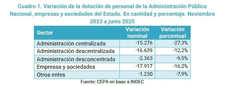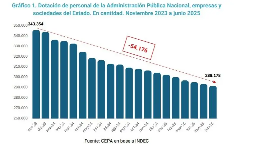 Entre noviembre de 2023 y junio último, la dotación de personal se redujo en 54.176 puestos de trabajo, representando una caída del 15,8%.
