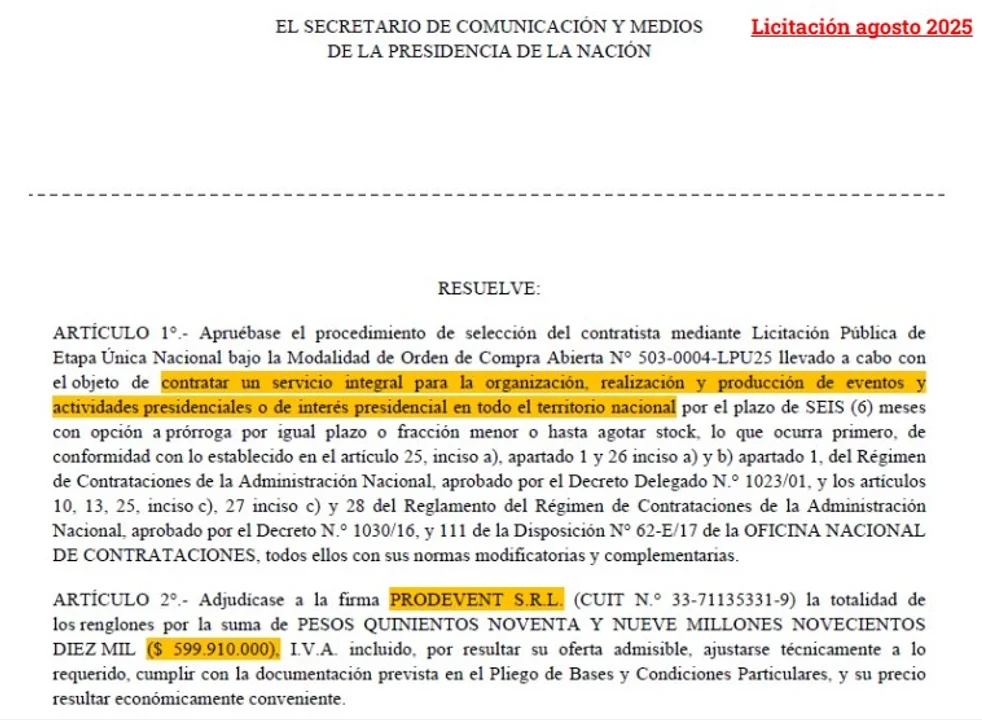 Los 16 renglones de la licitación de $600 millones que Manuel Adorni le otorgó a Prodevent.