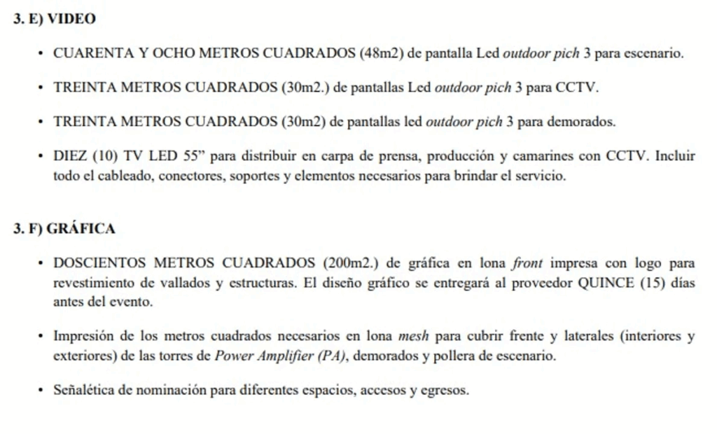La licitación está empapada de lujos y comodidades que sorprenden en tiempos de ajuste. La letra chica es casi por completo un copy & paste de la operación 23-0021-LPU24 encargada por Karina Milei en febrero, con la única excepción de que ahora fue eliminado el “cátering” que incluía entrada, plato principal, postre, bebida, medialunas, café, bocaditos, etcétera. Lo que continúa vigente son servicios como estos que relató Diagonales entonces:
