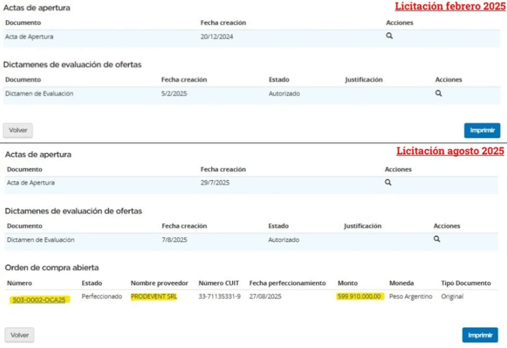 La adjudicación de la primera licitación en febrero, entonces ordenada por Karina Milei. La ganó Prodevent.