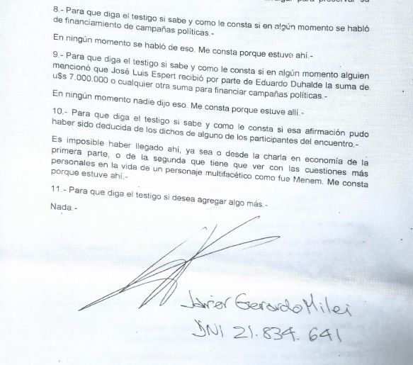 Es que Espert decidió llevar a juicio a sus detractores, por sentirse calumniado. Y sus abogados defensores fueron dos hombres célebres hoy en día: Diego Spagnuolo y Francisco Oneto. El mismo abogado que defiende al Fred Machado, el supuesto narcotraficante que le “donó” 200 mil dólares a Espert para la campaña de 2019 y le prestó su avión privado y su auto blindado. Casualidades de la vida, pero no es la única. En aquel juicio el que salió en favor de Espert fue el propio Milei. En una entrevista en el estudio de Oneto, el libertario declara que quienes hasta hace poco eran los únicos amigos que había tenido habían mentido en sus declaraciones televisivas. Es más que curioso: durante años había estado al lado de Giacomini y Fernández mientras ellos sostenían la falta de transparencia de Espert, pero sólo se acordó de salir a desmentirlos cuando se alió con el calvo. “Fuimos amigos por 16 años, pero en la actualidad nos encontramos distanciados por diferencias en lo político”, dice Milei en el archivo que se adjunta en la causa. Cuando le preguntaron si Menem había asegurado que Duhalde e intendentes le habían dado millones de dólares a Espert fue tajante: “Nadie dijo eso”.