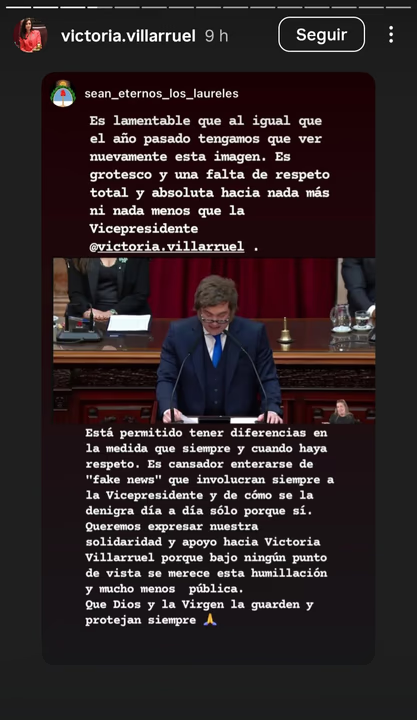 Más tarde, Villarruel respondió en sus redes sociales. Además de publicar fotos de ella misma en la Asamblea Legislativa con leyendas que decían “que nadie borre tu sonrisa”, la vicepresidenta compartió una historia en Instagram de un usuario que expresó su solidaridad ante la “humillación pública” que atravesó.