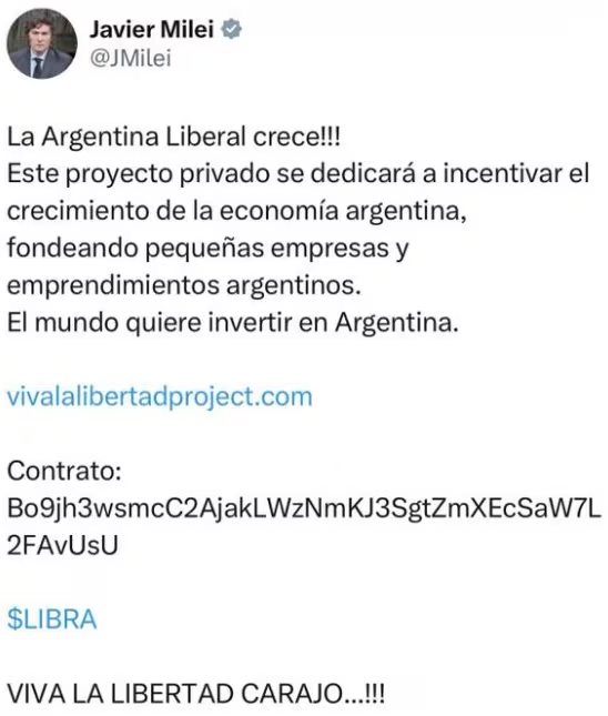 El episodio empezó con el tuit presidencial que decía: “¡La Argentina Liberal crece! Este proyecto privado se dedicará a incentivar el crecimiento de la economía argentina, fondeando pequeñas empresas y emprendimientos argentinos. El mundo quiere invertir en Argentina”,posteó Milei y remitió a la web vivalalibertadproject.com.El posteo ya no figura en las publicaciones de la cuenta.
